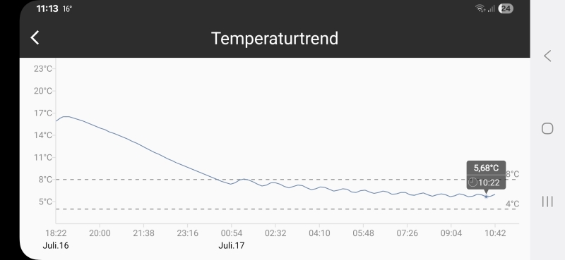 Bereits nach 4h im Gasbetrieb ist der Kühlschrank runtergekühlt: